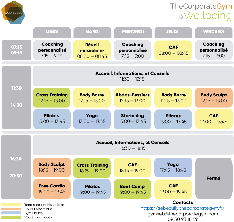 - Body Sculpt : Cours cardio associé à un renforcement musculaire général.